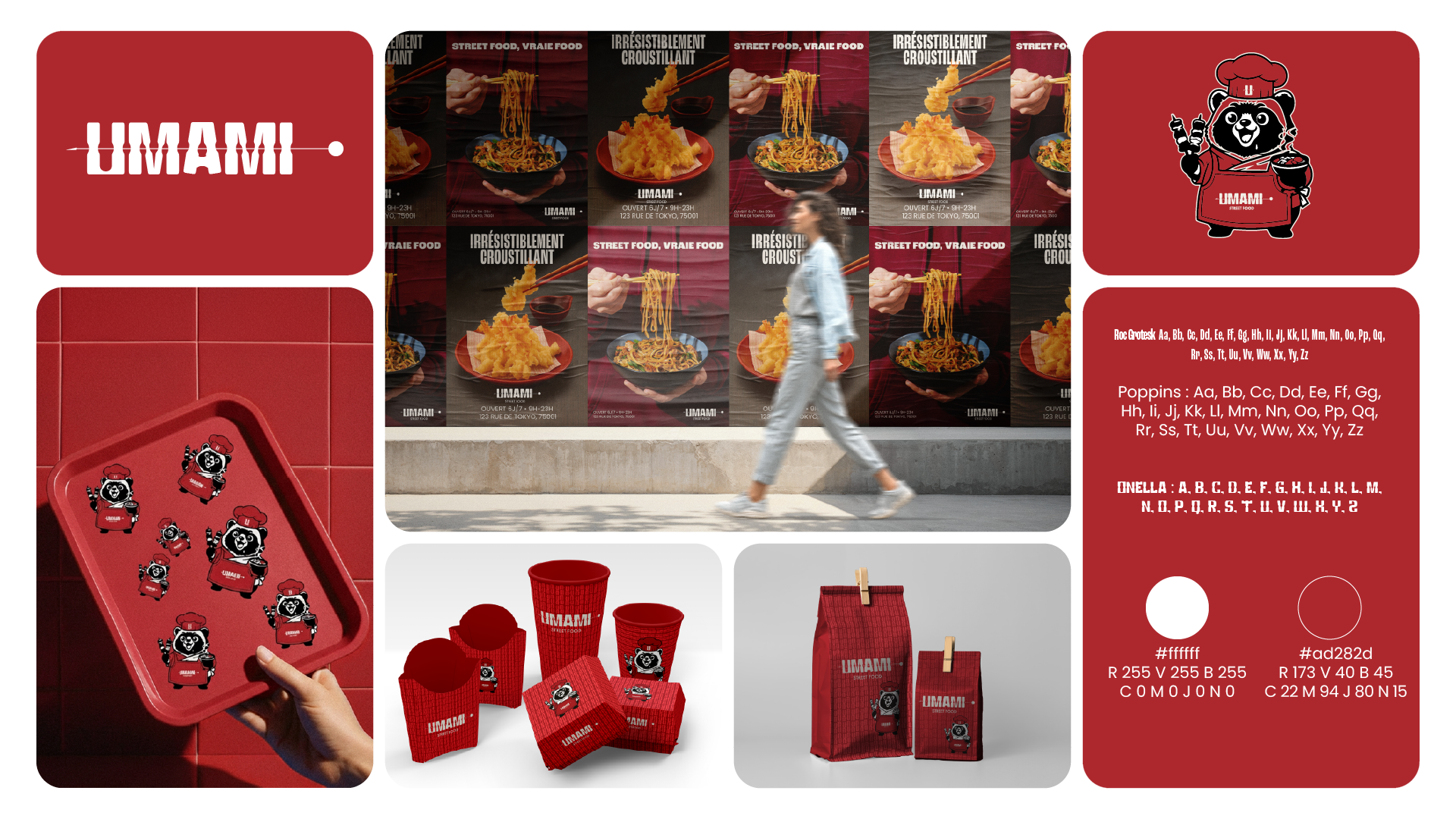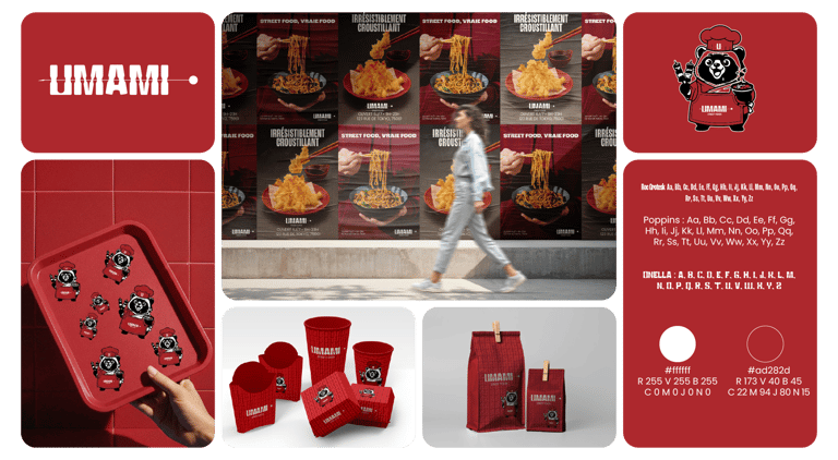 UMAMI est une enseigne de street food qui célèbre la "cinquième saveur" à travers une expérience culinaire rapide, authentique et généreuse. L'objectif était de créer une identité visuelle vibrante qui capture l'effervescence des rues de Tokyo tout en s'adaptant aux codes de la restauration urbaine moderne.