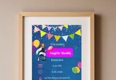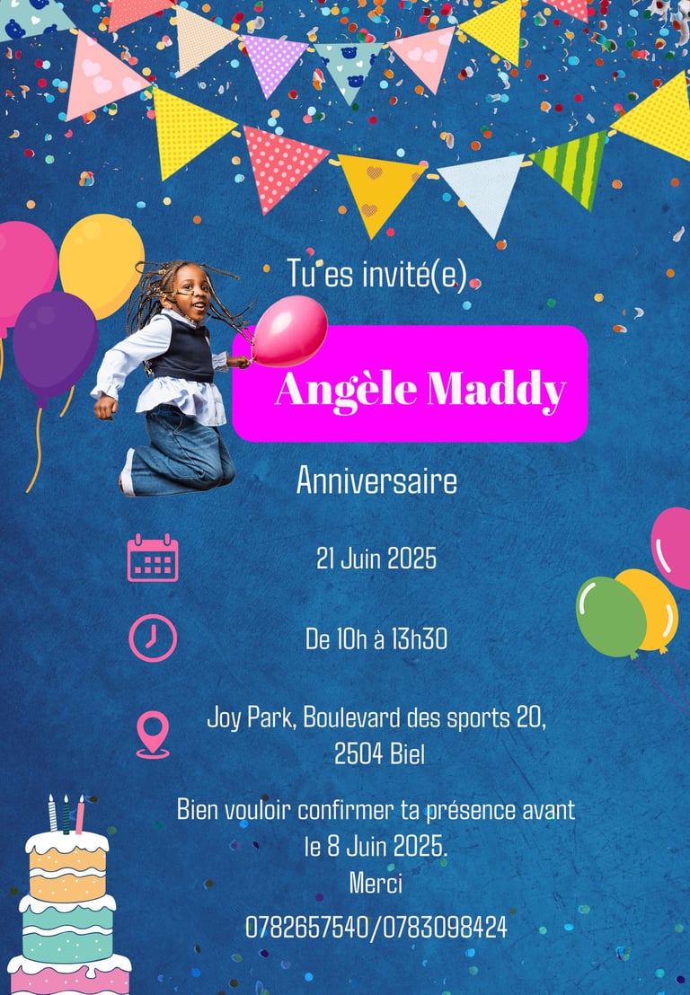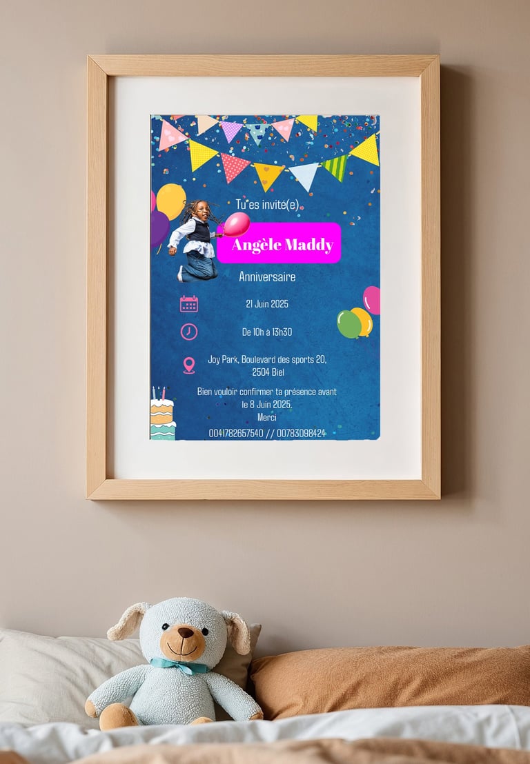 Entre couleurs festives, typographies ludiques et une mise en page chaleureuse, j’ai conçu ce billet comme un mélange d’amour, de créativité et de célébration. L’objectif était clair : capturer l’énergie et la joie d’un anniversaire d’enfant, tout en apportant une touche graphique originale.